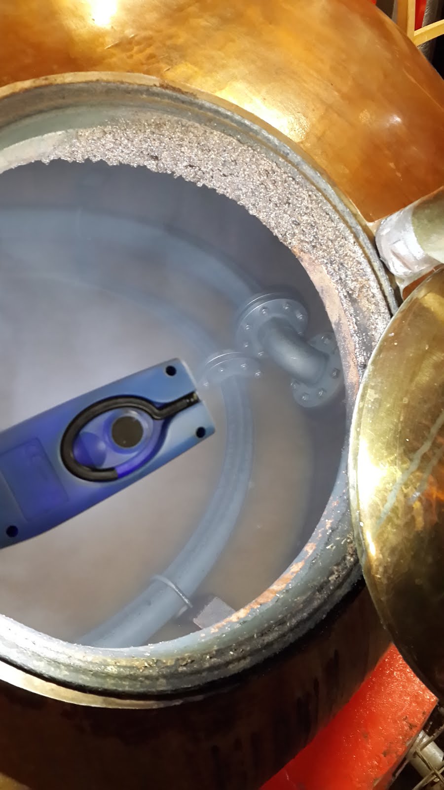 The pipes you see in the photo below are the heating elements like a large Shabbat kettle. Originally the stills were heated by direct peat or coal fire below. Today, most stills have these inside heating elements.